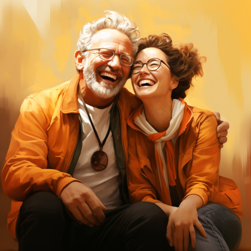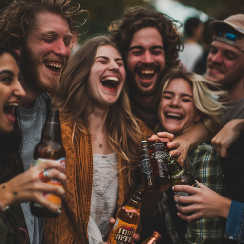 group of people with face visible laughing and cheering , hugging each other while holding alcoholic beverages