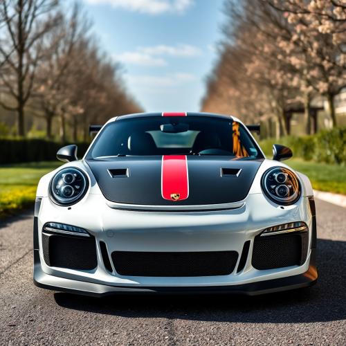 Close-out front view of an 8-level classical design building, 22 meters wide, with a penthouse on the top floor. The ground floor has plants on the left and a car entrance on the right. Each floor has 2 residential units, with two classic balconies extending from the facade. The penthouse features plants on its terrace. Include both sides of the neighboring buildings in the scene.