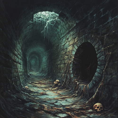 a long, dark, mysterious sewer tunnel with a spooky hole in the side wall that could be the entrance to a monster lair, include cobwebs and bones, dungeons and dragons style