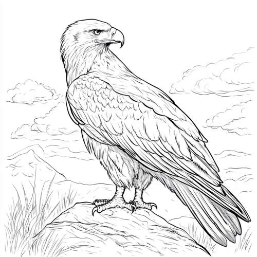 Golden eagle. Standing on a rock in the grass. The side should be visible. Coloring book illustration for children. There are clear puffy clouds behind.