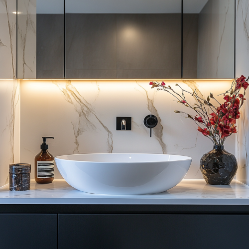 Wide and professional photo of a company's bathroom sink, the photo is of the front view of the sink, the decoration is elegant. The wall behind does not contain any details or elements.