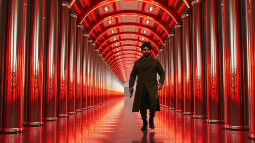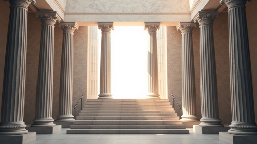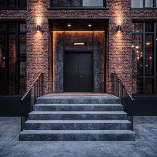 Hotel staff entrance, concrete steps, metal door, utility lighting, brick walls, service alley, point of view, photorealistic, stunning, 8k, award-winning, dramatic