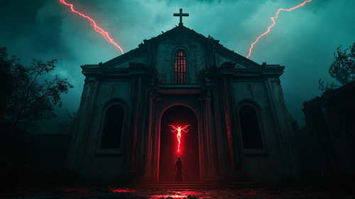 a low angle shot of entrance of satanic church goth style but with manuelino touches, dark sky, red lightning bolt high quality, Huge door with huge Demon standing in front, detalied, HDR, 8K ultra realistic, cinematic --ar 16:9 --style raw