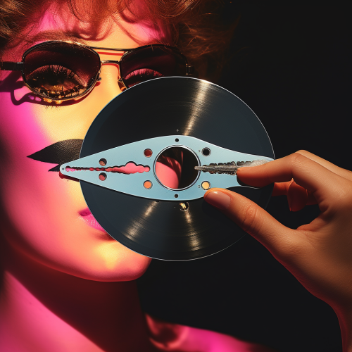 a person cuttinga cd with a knife, high quality image, 80s design, front view