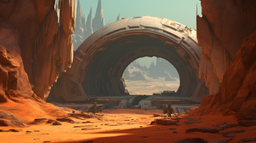 entrance to a tunnel in the ground, desert, hostile planet, sun, concept art, --ar 16:9
