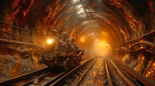 first person perspective. first person point of view. track out in front. Riding down steep hill in a goldmine style roller coaster cart. the setting is a magnificent lost temple tunnel, with intricate carvings. otherworldly light. --stylize 1000 --v 6.0 --ar 16:9