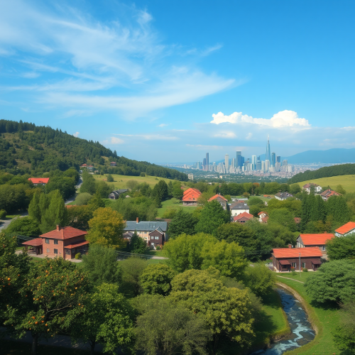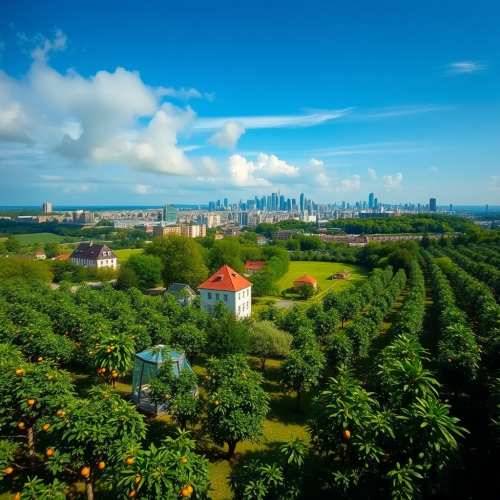 Create an advertisement-style photograph using an 18mm wide-angle lens. The scene features a 23-year-old Japanese man and woman inside a spaceship designed as a large, circular glass sphere. The man is wearing a vibrant red outfit and confidently piloting the spacecraft. The woman, dressed in a bright yellow outfit, is smiling as she holds a selection of fresh fruits and vegetables. Inside the spaceship, there are also some red cardboard boxes. The camera angle is positioned outside the spaceship, looking in through the glass. In the background, modern skyscrapers are visible, adding to the futuristic atmosphere of the scene.
