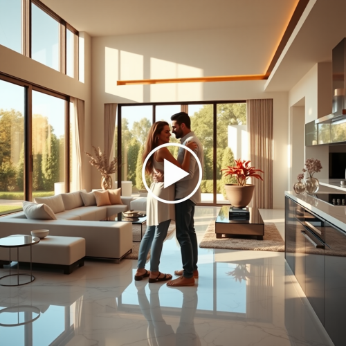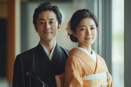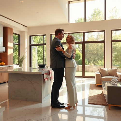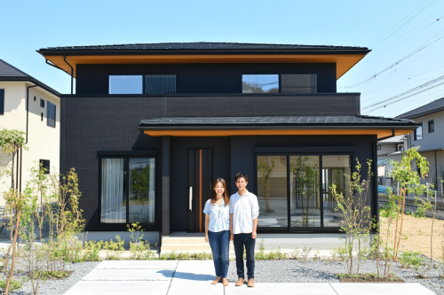 Realistic photo of a young Japanese couple posing in front of their newly built home, both smiling happily, casual attire, the clean and modern exterior of the house clearly visible, representing a new chapter in life. Photorealistic, realistic image, 8K resolution --ar 3:2 --v 6.1 --style raw