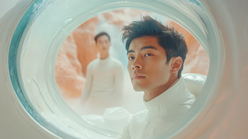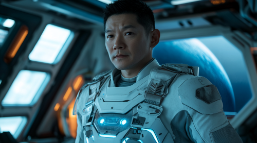 A 35-year-old Asian man with an ordinary, approachable face, exuding warmth and reliability. He has short hair, a gentle expression, and subtle signs of experience. Dressed in a sleek, futuristic white spacesuit with glowing blue accents on the chest and arms, representing advanced technology. Background: inside a spaceship’s futuristic space cabin, with a subtle outer space view through the windows, adding a sense of calm and safety. Character style: realistic and cinematic with a slightly stylized, soft look to convey warmth and approachability, capturing the essence of a kind and trustworthy father and astronaut. --ar 16:9