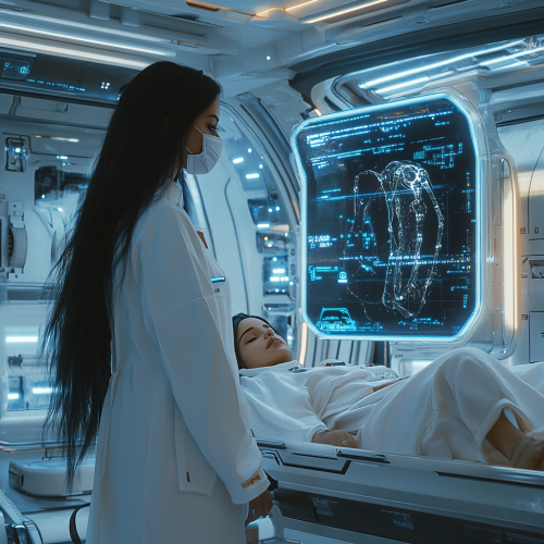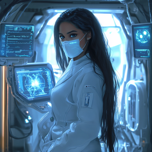 A futuristic sci-fi scene set in a spaceship's advanced medical bay. A beautiful doctor with an Arabic appearance, long black hair, and expressive eyes is dressed in a lab coat and mask as she cares for patients afflicted by a mysterious pandemic. The high-tech medical environment includes holographic screens with patient data, advanced equipment, and sleek, metallic surfaces illuminated by soft blue and white lighting. The doctor’s expression is both compassionate and focused, conveying her dedication and skill amidst the urgency of the outbreak