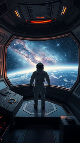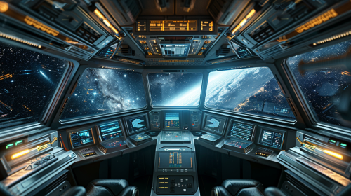 inside of a futuristic spaceship, view from the cockpit, we can see 3 big digital screens, through the windows we see an incredible milky way, hyperrealistic, 4K --ar 16:9 --v 6.0
