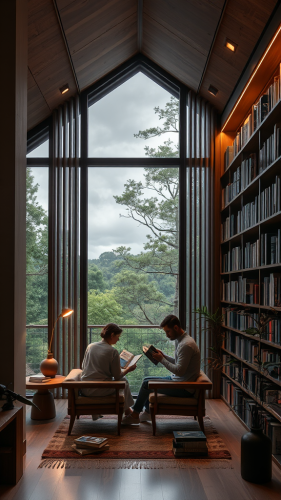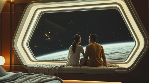 cinematic still. A couple sitting together, looking out of an art deco futuristic window in a luxurious open plan apartment on a spaceship. With the blackness of space outside. --ar 16:9 --v 6.0