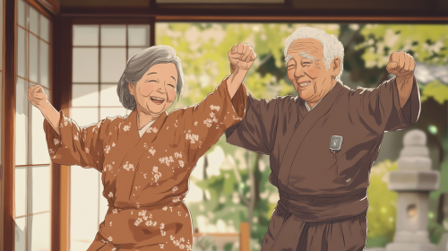 a hand-drawn storyboard of an elderly Japanese couple in their home dancing slowly. The woman is wearing a small sensor on her arm. They both smile --ar 16:9