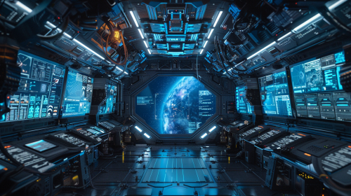 inside of a futuristic spaceship, with many big digital screenboards, through the windows we see an incredible milky way, hyperrealistic, 4K --ar 16:9 --v 6.0