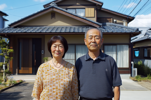 Realistic photo of a 30-year-old Japanese couple with a youthful appearance, standing in front of a newly built single-family house, couple clearly visible in the center, both showing smooth skin and vibrant expressions, house facade also visible but not overwhelming. Photorealistic, realistic image, 8K resolution --ar 3:2 --v 6.1 --style raw