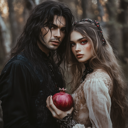 realistic handsome man with long black hair wearing black gothic clothing and a beautiful woman with light brown hair with red glitter eyeshadow wearing a light colored dress holding a pomegranate at night in the woods. Magical. Bokeh.