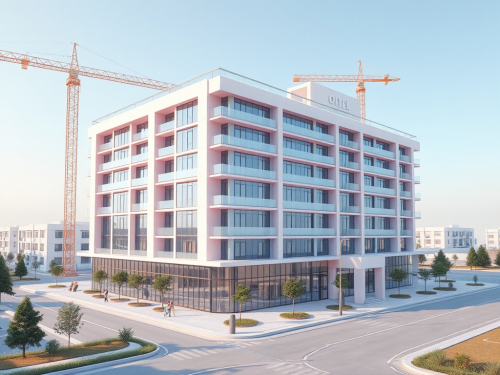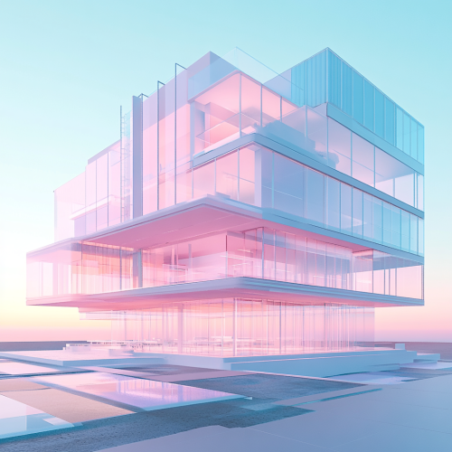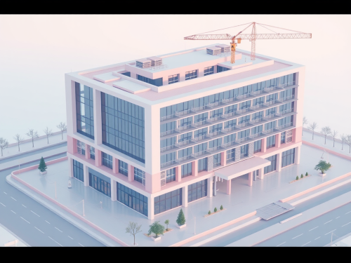 Create a hyper-realistic, delicate 3D render of a modern hotel under construction. The hotel features a rectangular structure with a mix of soft pastel colors, primarily pink and blue tones. It has multiple stories with large glass windows and flat facades. Include fine details such as realistic shadows, smooth textures, and lighting that enhances the structural outline. The building should have clear, crisp edges, with realistic materials and textures, matching the exact proportions and layout of the hotel in the image. The surroundings should reflect an urban setting with smooth pathways and minimalist landscaping. The entire scene should have a futuristic, modern aesthetic with soft reflections on the glass windows and clean architectural lines. v6.1