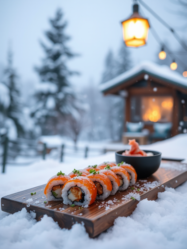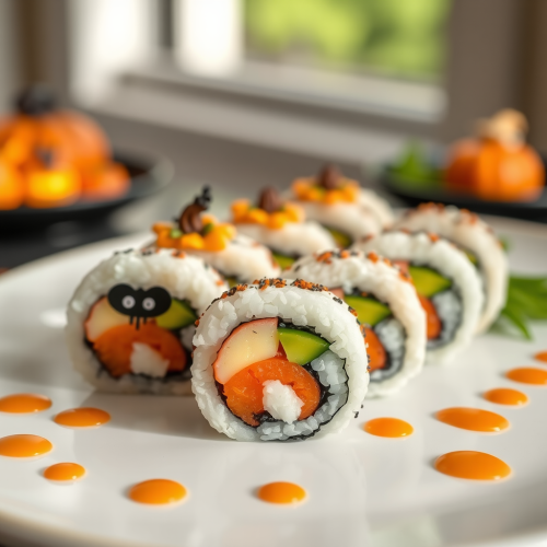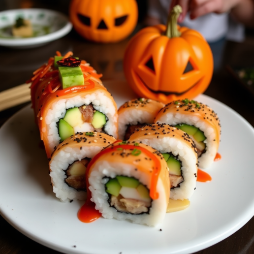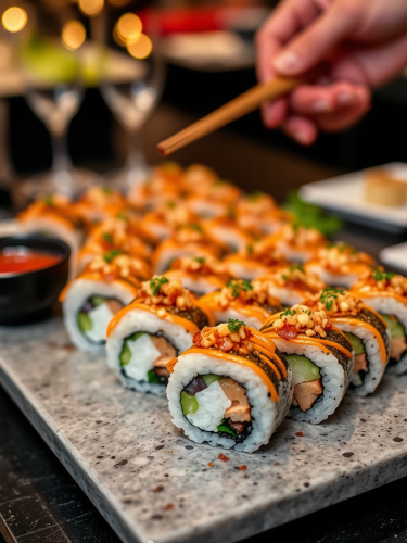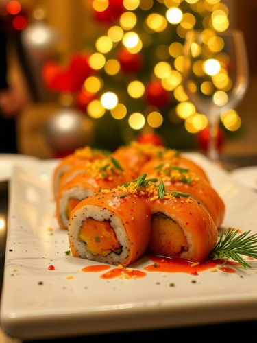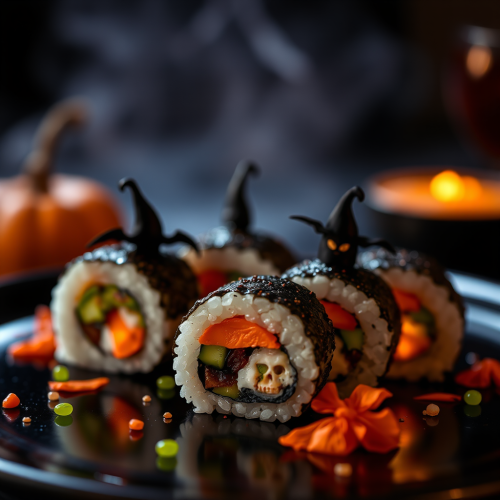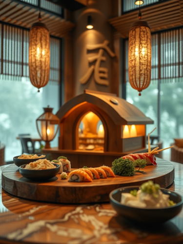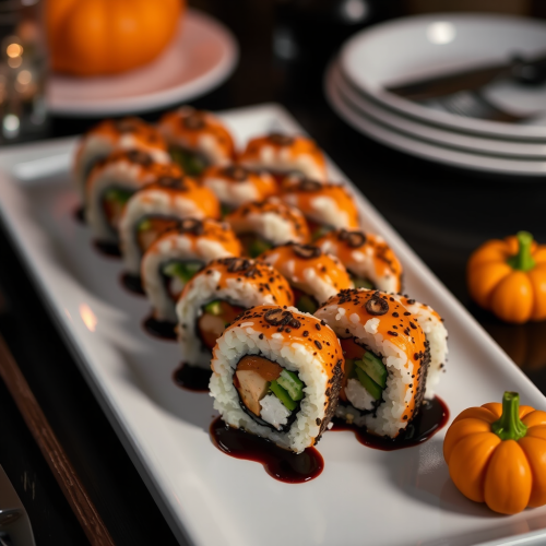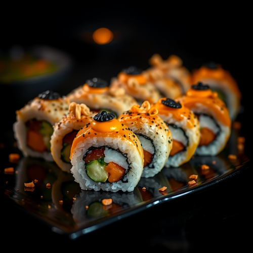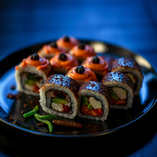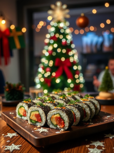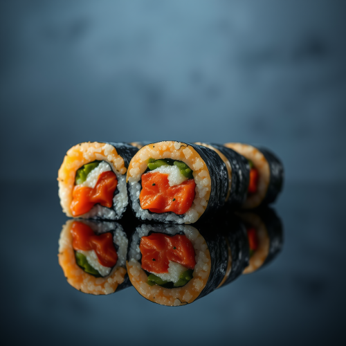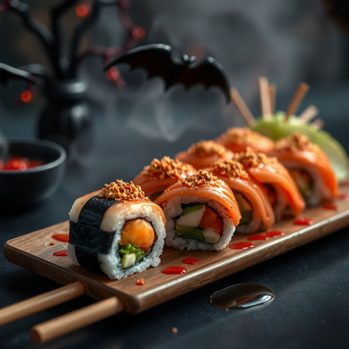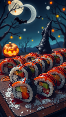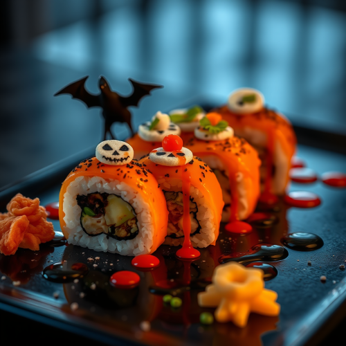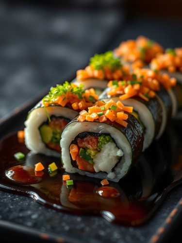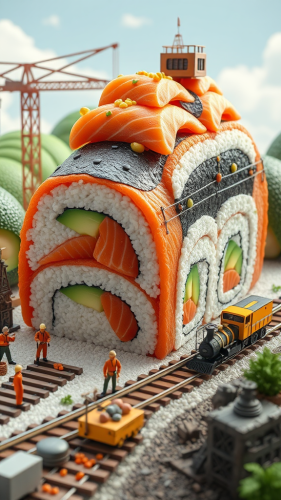 "A mesmerizing and ultra-detailed 3D render of a surreal sushi-themed construction site where a giant sushi roll is being assembled like an architectural marvel. Miniature workers, dressed in chef-style construction gear, carefully slice through layers of fresh salmon, compact sushi rice with tiny steamrollers, and roll nori sheets using crane-like chopsticks. Tiny carts on a railway track transport glistening fish roe, while a soy-sauce-colored steam train chugs along, carrying wasabi 'boulders.' In the background, towering avocado slices resemble lush green hills, adding a whimsical charm to this delightful edible world."