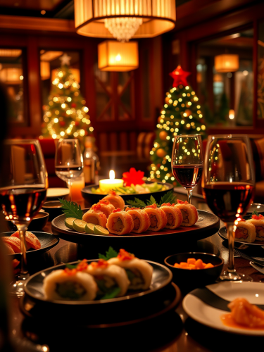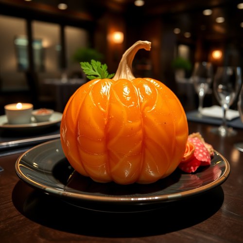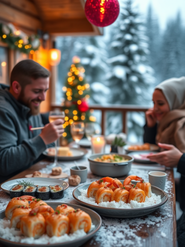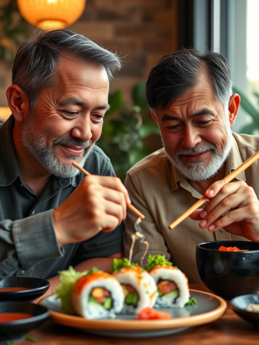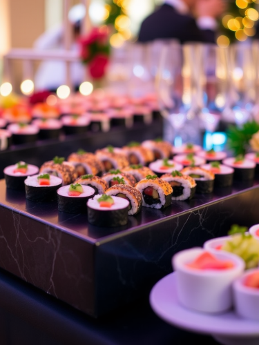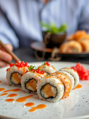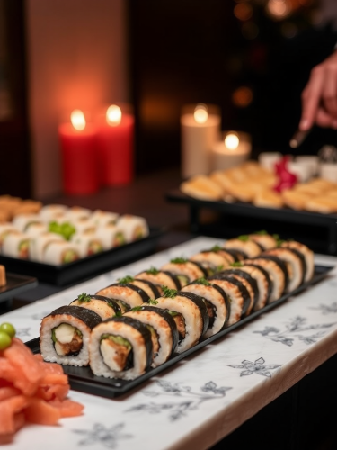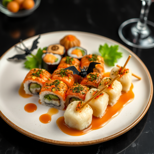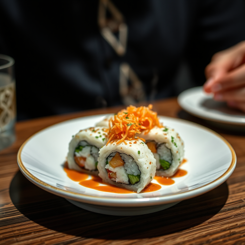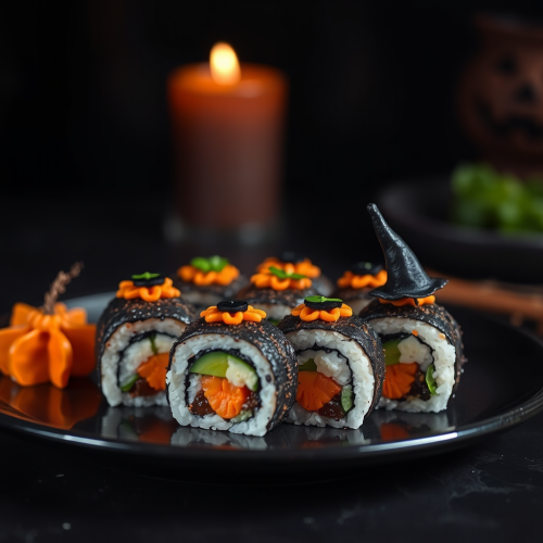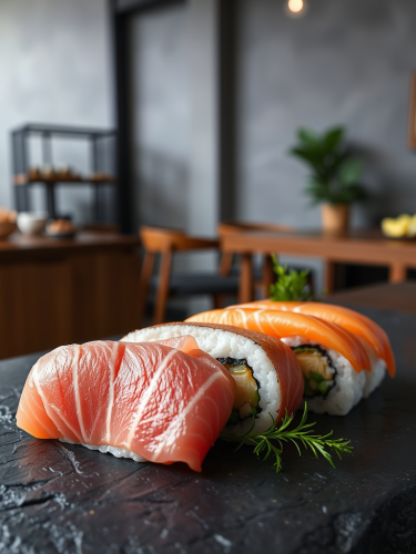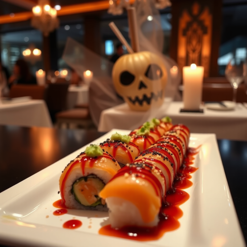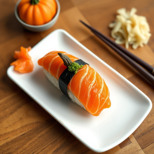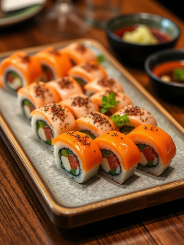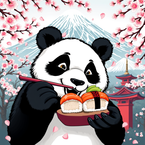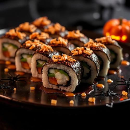 "A mesmerizing and ultra-detailed 3D render of a surreal sushi-themed construction site where a giant sushi roll is being assembled like an architectural marvel. Miniature workers, dressed in chef-style construction gear, carefully slice through layers of fresh salmon, compact sushi rice with tiny steamrollers, and roll nori sheets using crane-like chopsticks. Tiny carts on a railway track transport glistening fish roe, while a soy-sauce-colored steam train chugs along, carrying wasabi 'boulders.' In the background, towering avocado slices resemble lush green hills, adding a whimsical charm to this delightful edible world."