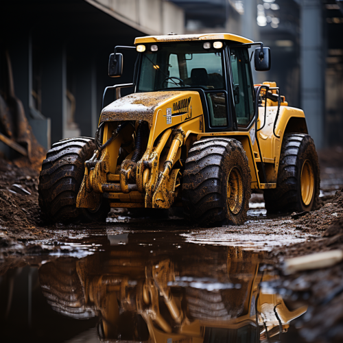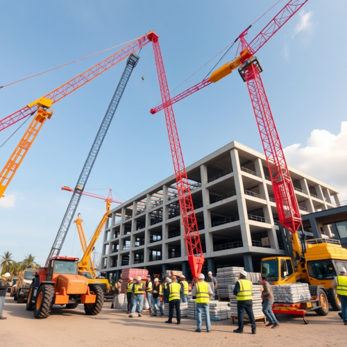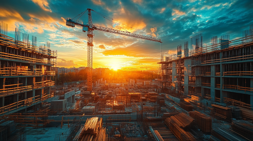 Amazing wide shot of a modern building construction site in the city with sunrise sky and blue palette. Construction cranes, excavators and wooden frames are visible, demonstrating the industrial character of the site. This image is a surreal industrial photo --ar 25:14 --s 300 --v 6.1