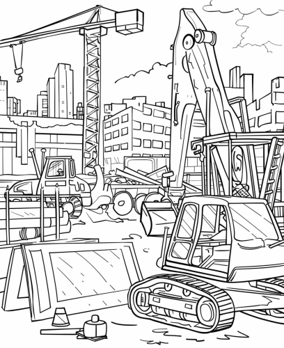 A very simple coloring page featuring an illustration of a construction site in black and white and ready to color. The background is white to capture attention. Black lines only, no colors. In the style of a sketch with low detail, vector graphic line art in a flat design style with simple, clean bold outlines and strong, crisp black lines. --ar 9:11 --no grayscale --v 6.0