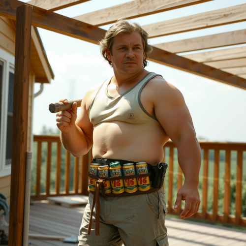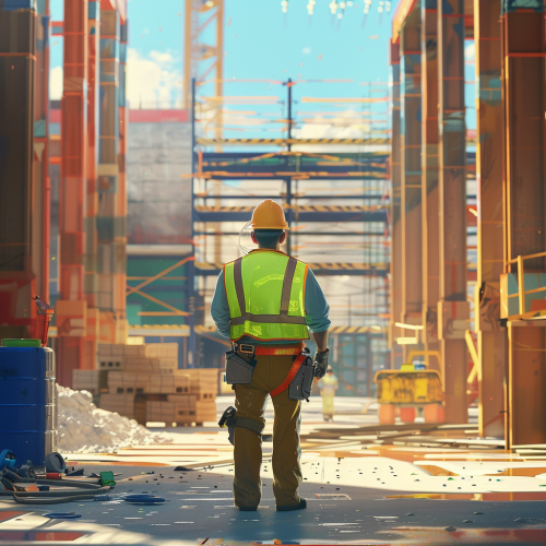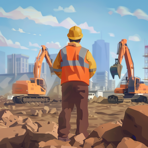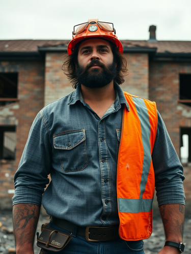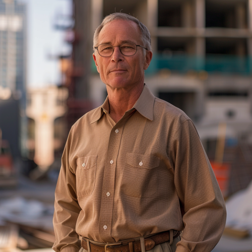 photorealistic photo of a caucasian American man, age 50, business casual attire, portrait body shot on a construction site