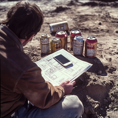 over the shoulder shot of a man reading construction plans working outdoors on a construction site in the 1970s in North America. There is an iphone laying flat on top of the construction plans. There are 5 beer cans laying around. photography style consistent with the 1970s. --s 50