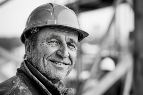 black and white portrait of smiling man in hard hat, construction site, worker behind him out-of-focus, Leica M6 Monochrom with Summilux-M70mm f/2 ASPH lens, natural light, portrait photography, fujifilm x-t4, Leclerc camera for fintess magazine cover shot --ar 128:85 --v 6.0