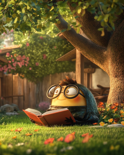 an animated sushi roll being so intellectual with glasses on reading a book in a garden under a tree - disney pixar style - disney movie poster --ar 4:5