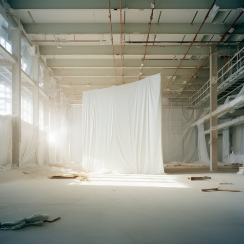 inside a consruction site wrapped in white fabric, concrete and steel, large room, natrual light, soft light, cloudy, captured with a pentax 67 camera, portra 400 filmstock