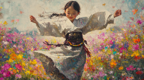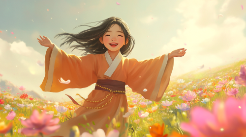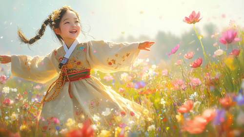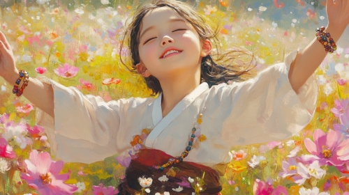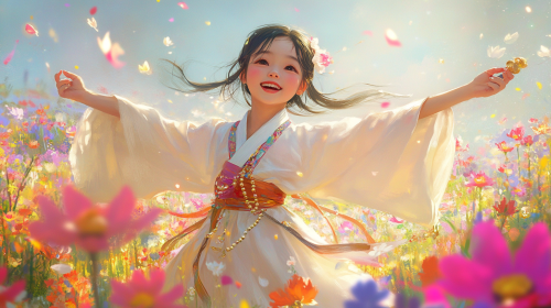 A 10-year-old Korean girl illustrated in the style of a bodhisattva, dancing joyfully in a flower field on a clear day, with a bright, illustrated smile on her face. She is depicted wearing illustrated prayer beads on her wrist, moving gracefully among a variety of colorful, illustrated flowers. Her bodhisattva robes are illustrated with a soft, golden glow that gently illuminates the illustrated surroundings. The entire scene, including the girl, flowers, and landscape, is done in an illustration style, with soft lighting, gentle colors, and delicate brushstrokes, conveying a sense of peace, tranquility, and beauty. --ar 16:9
