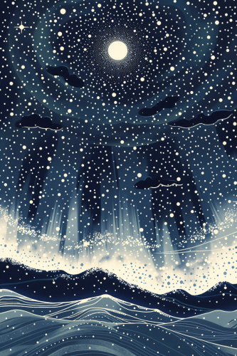 a digital illustration of aurora borealis in a starry sky during a sun eclipse, navy blue and white colour pallete, Dan Mumford artstyle --ar 2:3 --no land