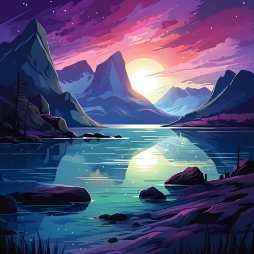 A seaside backdrop from lofoten with mountains and sea the aurora borealis in turqoise and purple in the night sky realistic comic cartoon style