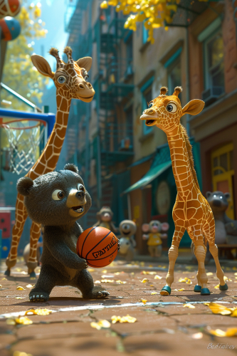Baby bear and baby giraffe dribbling basketball in giant’s playground, oversized toys, ground-level view, bright primary colors, cartoon style --no logos or branding --v 6.0 --stylize 600 --ar 2:3