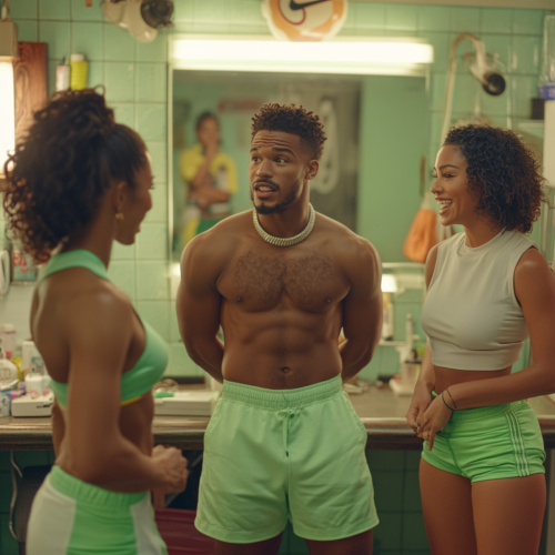 a wideshot of a black man with a bad hairline staring into a mirror inside of barebershop while a black man who is a barber looks at him nervously while a light skin black woman with hazel colored curl hair wearing a light green v neck with green shorts and green and white nikes laughs at the man with. an uneven hairline