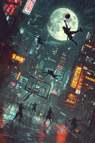 Epic basketball game played by stealthy ninjas on a rain-slicked rooftop court under a glowing, dramatic moonlit sky. The court is surrounded by towering city skyscrapers lit by vibrant neon signs. A ninja flips mid-air for a powerful slam dunk, while another speeds across the court in a blur of martial arts precision. Shurikens fly through the air, intercepting the ball with perfect timing. The ninjas move with intense dynamic motion, with motion blur trailing behind them to emphasize their speed and agility. Meanwhile, the cityscape in the background remains sharp and detailed, with neon lights reflecting off the rain-soaked court. Use moody, cinematic lighting from the moon and neon signs, casting deep shadows and dramatic highlights on the scene. The color palette is dark greys, shadowy blacks, neon reds, and electric blues. Ultra-detailed textures for the ninjas and urban environment, with a stylized balance between realism and cartoon action. Focus on motion blur for ninjas, but ensure no blur on the cityscape for clarity and depth. --v 6.1 --ar 2:3 --q 2 --no grain --s 250