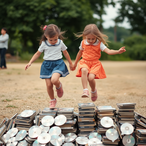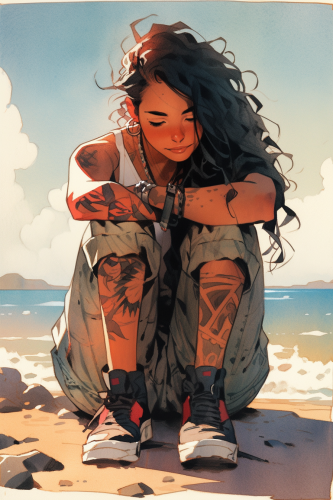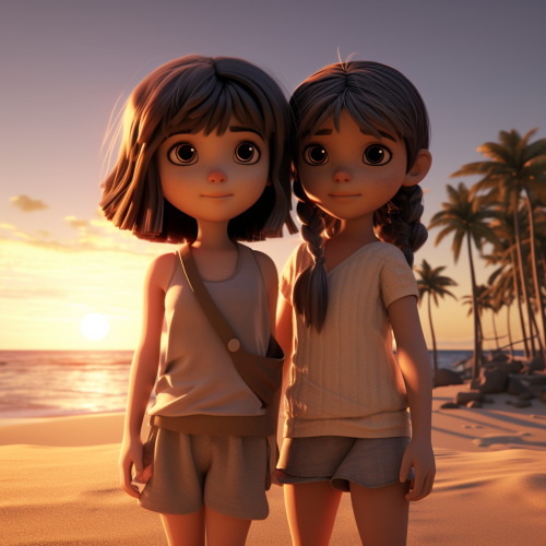 Two dark Cute asian girls, young and older, on the beach, sun, dawn, vacation, cinema 4d, blender