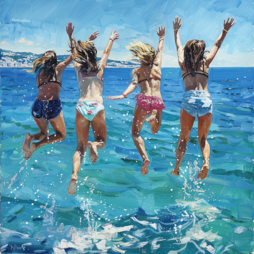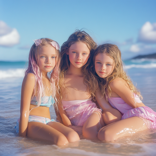 ultra realistic, fashion shoot group of 3 to 12 years old girls for a hair care ad, pastel colors, lens flair, Bondi beach, heavy film grain, strong diffusion filter, 35mm
