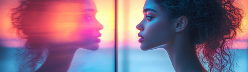 A man looks at himself in a futuristic mirror, smiling as his hair grows in real-time. Blue digital lights and soft glowing particles surround him, symbolizing hair regeneration and technology. His face shows excitement and pride, with the sleek, modern setting adding a sci-fi vibe