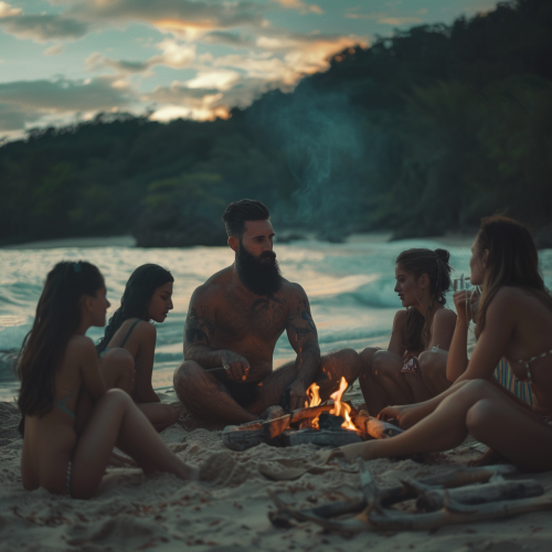 a bearded israeli men sitting at a beach in thailand around a campfire during the day. 5 girls beside him all wearing swimsuits. cinematic, Hyperealistic, 8K. ar--16:9