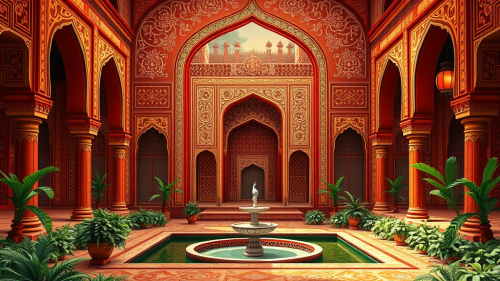 A six sided glass house that has four levels. There are stairs leading from the door to a terrace that has glass columns surrounding silver lounging chairs. There is soft lavender colored grass, and a garden of red flowers with large black lions playing in. There are fairies and golden, winged horses flying in the air. There are yellow mountains surrounding the scene.