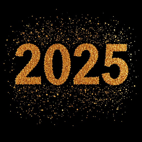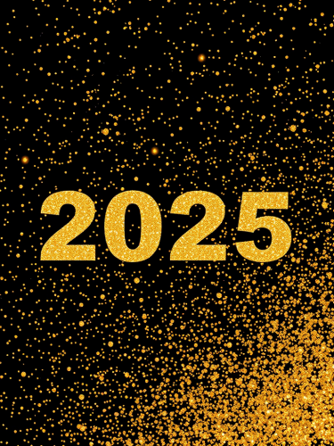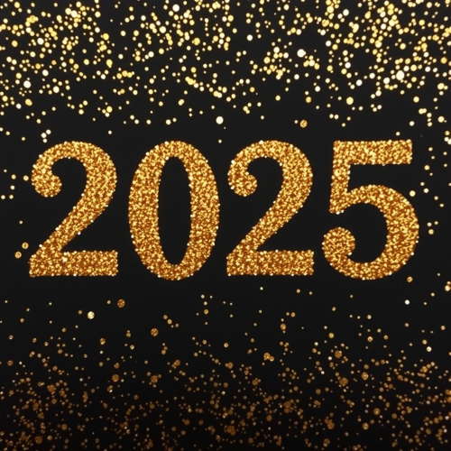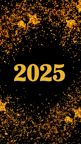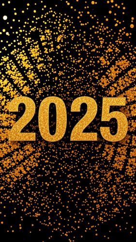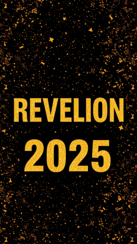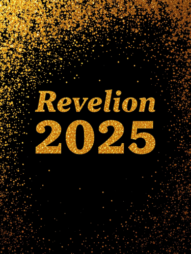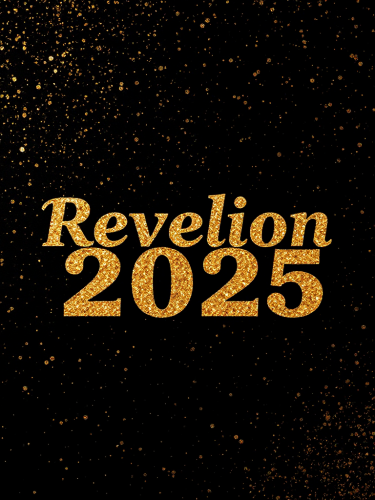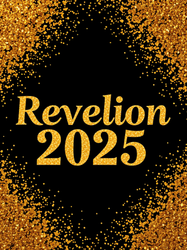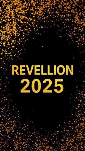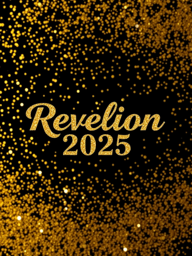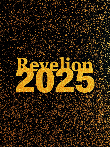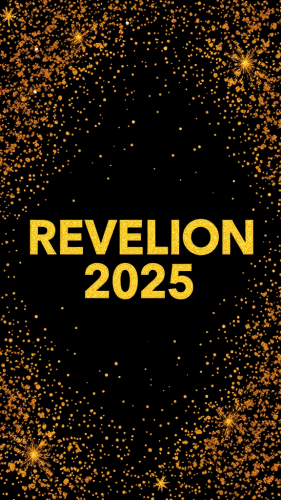 Create a black background filled with various shades of shimmering gold glitter, ranging from bright yellow gold to deep bronze. The glitter should appear randomly distributed, creating a sparkling effect. Subtly blend the lettering Revelion 2025 with gold big borders into the background using the same glittery material, making it slightly more prominent but still harmonious with the overall glittery design.