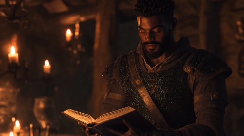 black male bard, wearing black glittery doublet, slim, dark skin, reading poetry book on stage in tavern lit by dark moody lighting, full body portrait, style of video game character concept art, --ar 16:9