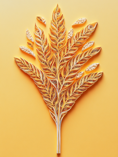 feathery, patch quilling, product mockup, glitter, Millions of grains of wheat shaped to form the symbol of the wheat spike --ar 3:4 --no fibers, branches