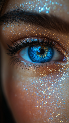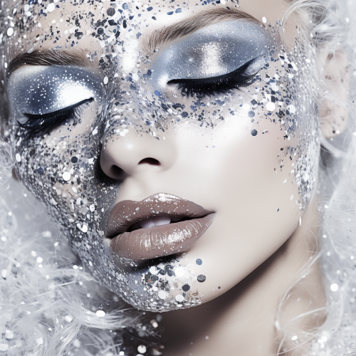 A photo of a white guy kissing a girl on the neck. He has his nose buried in her neck. The face of the guy is hidden. The girl is all covered in glitter, bright purple lilac glitter. --style raw
