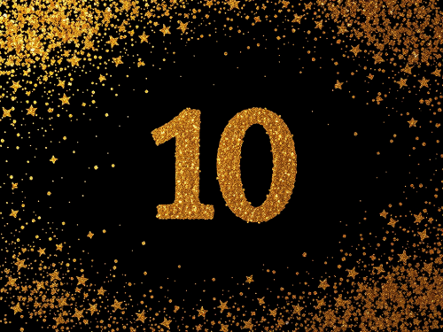 Create a black background filled with various shades of shimmering gold glitter, ranging from bright yellow gold to deep bronze. The glitter should appear randomly distributed, creating a sparkling effect. Subtly blend the number 10 into the background using the same glittery material, making it slightly more prominent but still harmonious with the overall glittery design.