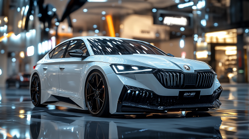 realistic of elegance 2025 Skoda Octavia modified, changes in the bumper and grilles with small but neat particles, hyper detailed, contrast white color, front-side angle, parked inside showroom --ar 16:9 --stylize 700