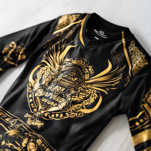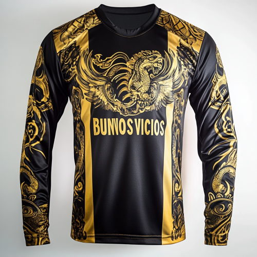 a high-resolution image of a black and gold long sleeve motocross shirt laid naturally on the floor. The shirt features a Mexican Aztec design inspired by the Mexican soccer national team jersey, with old English lettering that reads 'BUENOS VICIOS' on the chest. Instead of a typical motocross logo, it includes a simple Aztec dragon head logo, akin to the style of a Fox motocross or baseball logo. Use a simple, neutral backdrop (white, light gray, or soft beige) and ensure even, soft lighting to highlight the shirt's gold accents and intricate patterns. Focus on close-up shots to clearly show the design and details, with no additional props or distractions in the frame."