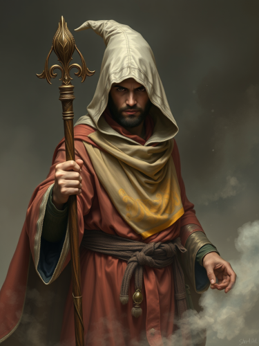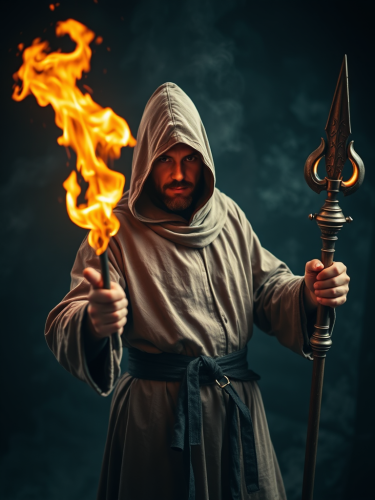 male hooded angel, face not visible, slightly looking down, front view and holding a sword in front of him, with wings that are slightly outstretched. He is levitating and his robes are covering his feet. Realistic. Highlights and light tones with dark contrast on the image. --ar 9:16