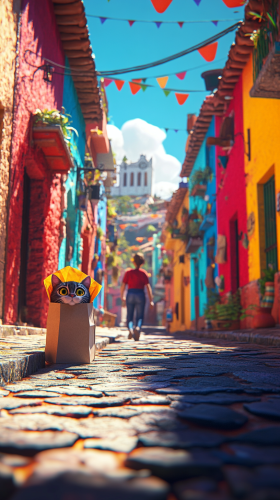 a 3D animated scene of a person walking down a colorful street, holding a takeout bag with a tabby cat's head peeking out, munching on a taco, oblivious pedestrians --ar 9:16